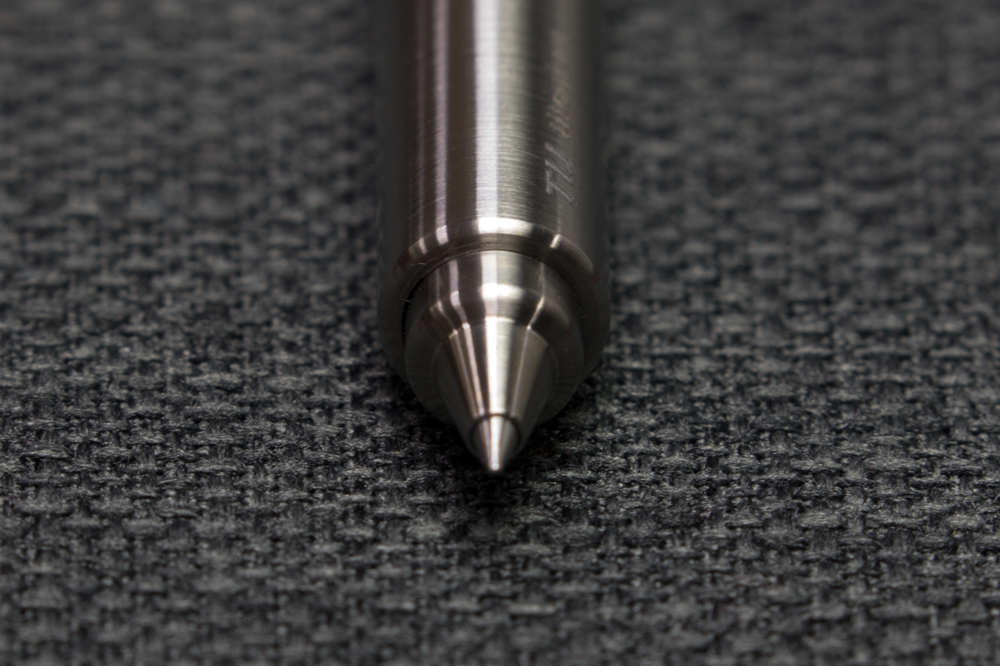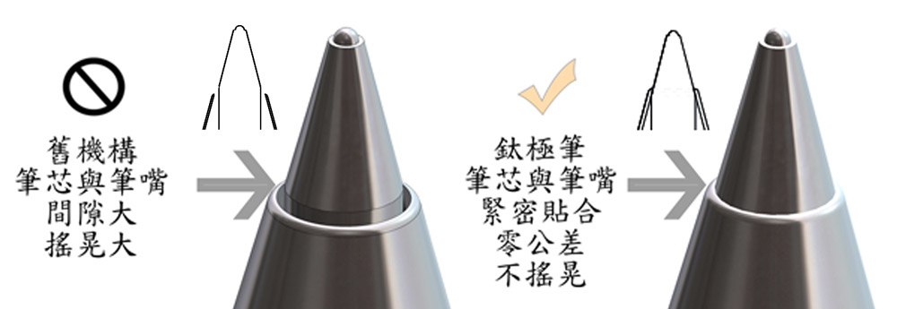 ▲一般筆的筆芯都是簡單的直接穿過去,裝在鈦極筆的筆芯伸出時被精密加工、特殊尺寸的筆嘴包覆固定著所以完全不搖晃。