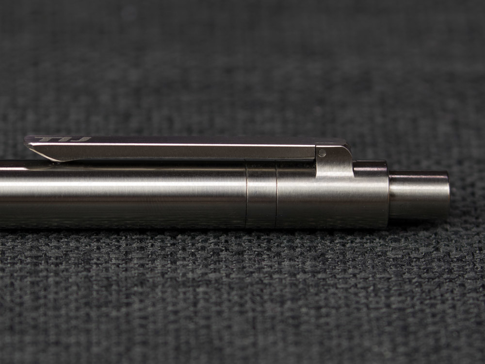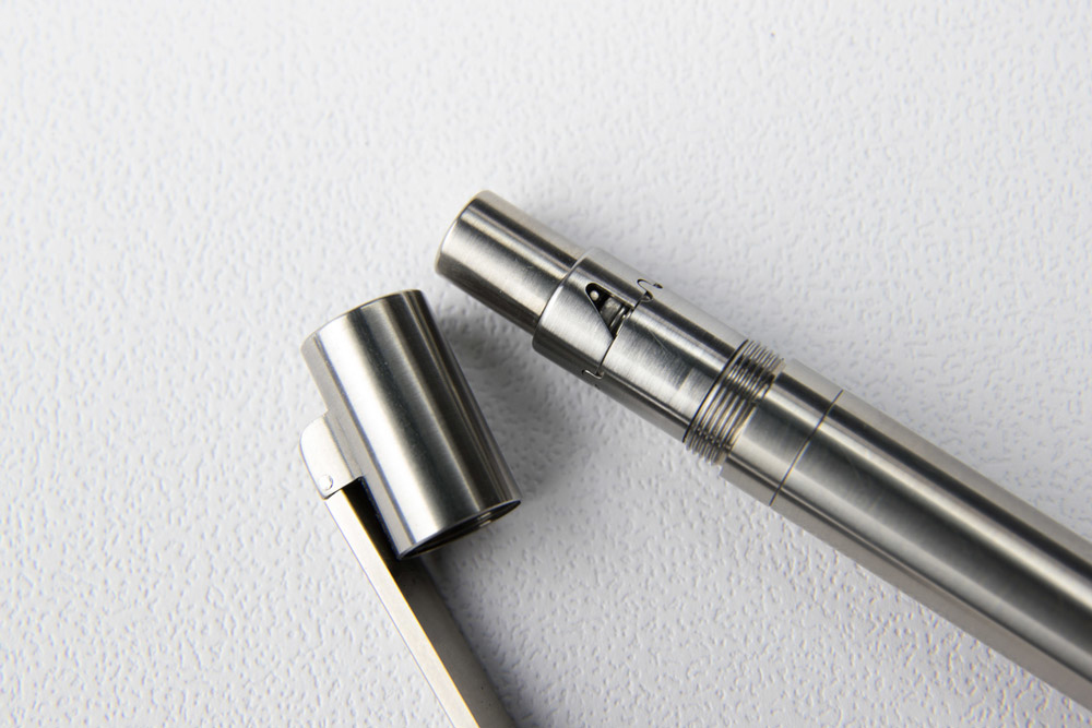 上管我們選擇使用最稀有且昂貴的一體成型CNC銑削加工方式來製作,這樣的製作方式讓鈦極筆堅固耐用,不會有用久了搖晃變形的問題。筆夾一樣使用一體成型CNC銑削加工方式製作,再加上彈簧的機械結構,在細節上下足功夫,筆的尾端我們用極少見的立體浮雕方式刻上我們的LOGO,彰顯不凡,尾部的線條簡約,用機械的結構勾勒出整體的造型。