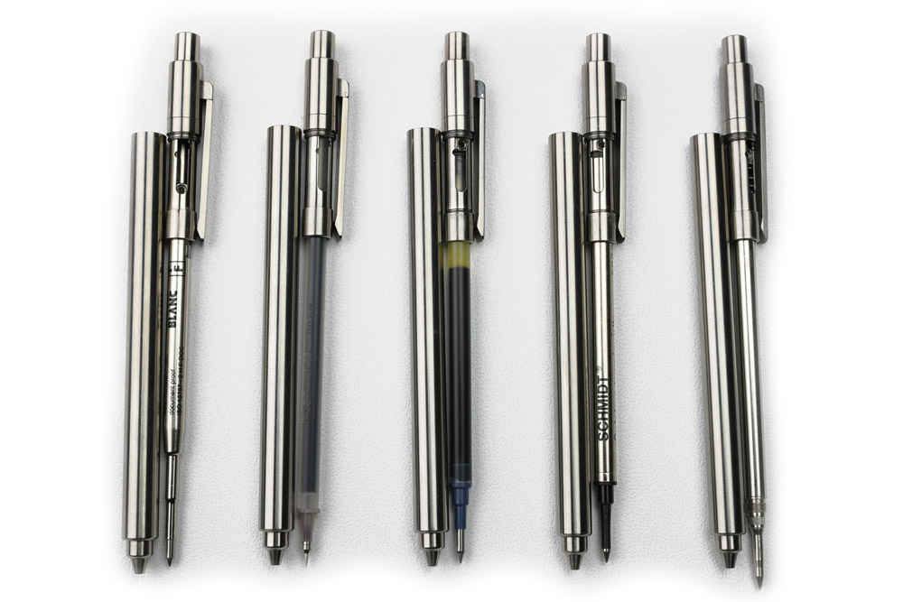 市面上筆芯的種類太多,規格卻不統一、往往買了一支筆,筆芯寫完馬上變孤兒,購買筆芯非常困難,不然就是筆芯太貴,多寫幾支又可以買新的筆,鈦極筆可以使用好寫又方便取得的的筆芯,文具行輕鬆可以買到,寫再多都不怕,也可以多買幾種筆芯回家,偶而換換筆芯、換換心情。只要筆芯長度、粗細在範圍內,不管是中性筆、鋼珠筆、原子筆或自動鉛筆筆芯通通可以裝進去,而且每種筆芯的筆尖都不搖晃。