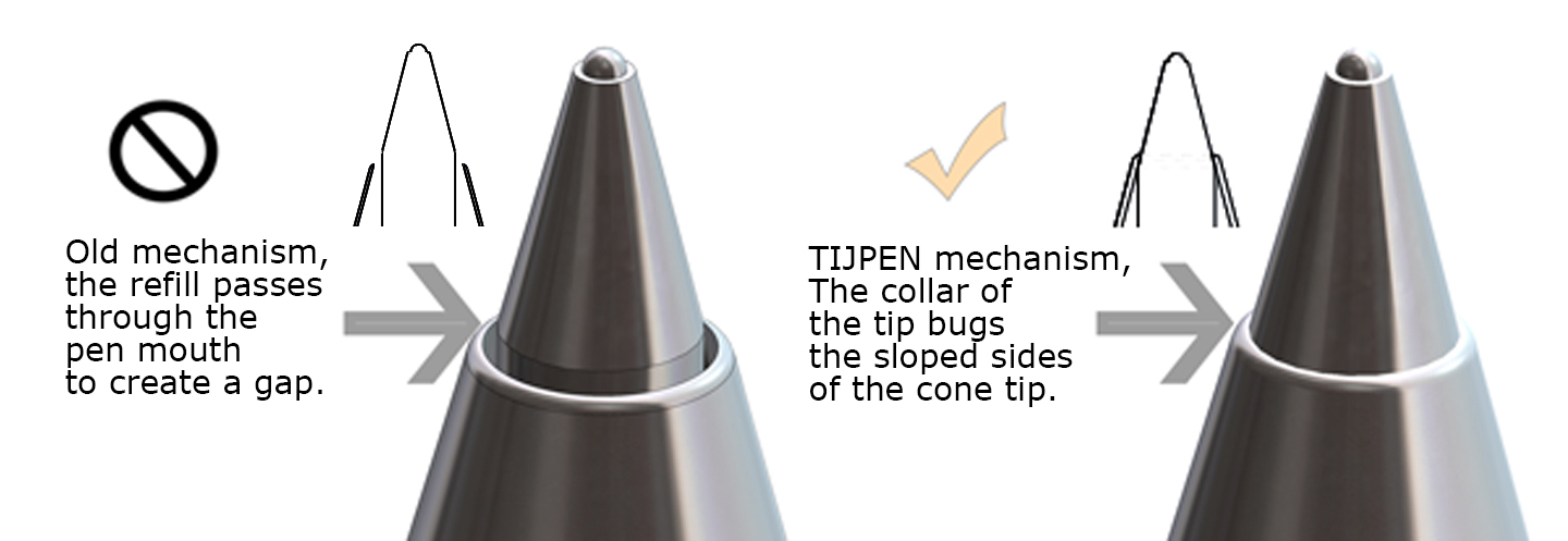 ▲ Standard pens the refill simply extrudes through the pen directly, however, TIJ ™ Titanium Pen the collar of the tip bugs the sloped sides of the cone tip, and constant pressure is applied through a spring in the knocker to prevent tip wobble.