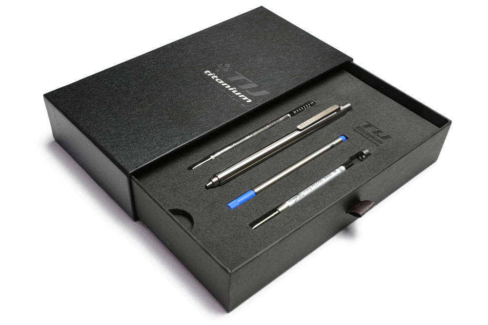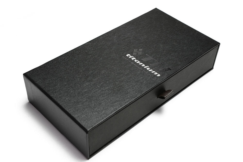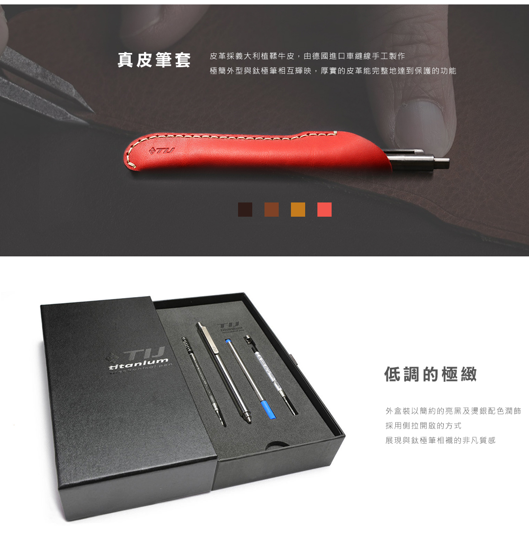 外包裝使用高級厚質美術紙,以人造皮革側拉開啟的方式,展現與鈦極筆相襯的非凡質感,外盒以簡約的亮黑及燙銀配色潤飾,不論是送禮或收藏都是最佳的選擇。