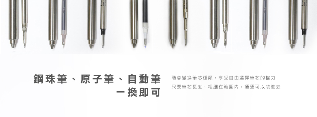 2. 支援三百以上筆芯:可使用筆芯粗細範圍5.5MM~6.2MM之間,可選擇百樂、三菱、萬寶龍、派克、MUJI、SCHMIDT...等超過百種市售筆芯,甚至未來新的筆芯只要尺寸符合也可使用,是世界上第一支可使用數百種筆芯的自動筆。